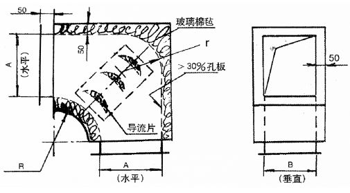 • ZWB型消聲彎管是使風管短邊B拐彎90度,并具有一定消聲作用的彎管,其拐彎半徑為風管內壁長邊A,吸聲材料厚為50和100mm。